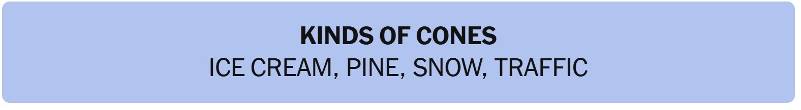 - KINDS OF CONES – ICE CREAM, PINE, SNOW, TRAFFIC