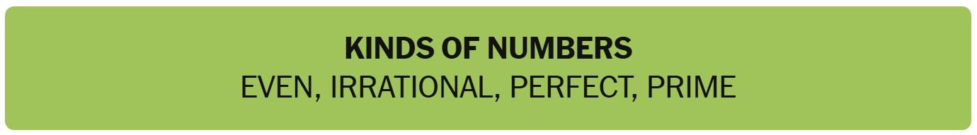 - KINDS OF NUMBERS – EVEN, IRRATIONAL, PERFECT, PRIME