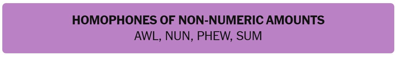 - HOMOPHONES OF NON-NUMERIC AMOUNTS – AWL, NUN, PHEW, SUM