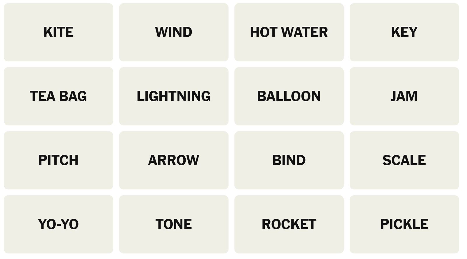 There are sixteen words for the Connection puzzles, which are: