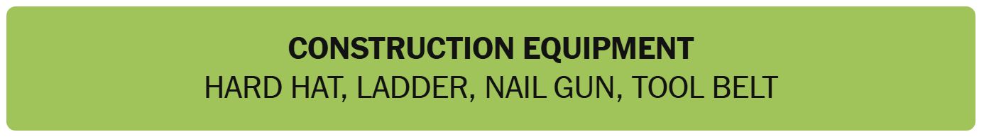 - CONSTRUCTION EQUIPMENT – HARD HAT, LADDER, NAIL GUN, TOOL BELT