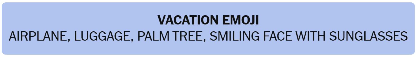 - VACATION EMOJI – AIRPLANE, LUGGAGE, PALM TREE, SMILING FACE WITH SUNGLASSES