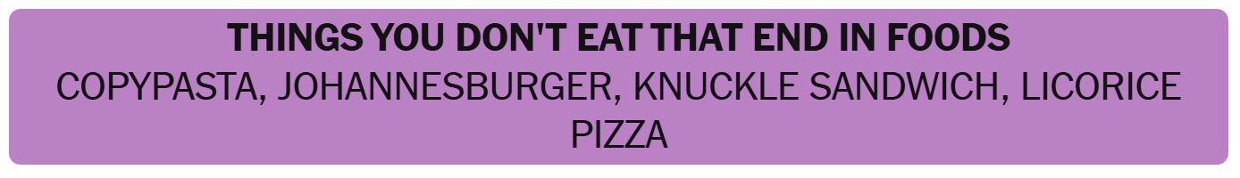 - THINGS YOU DON’T EAT THAT ENDS IN FOODS – COPYPASTA, JOHANNESBURGER, KNUCKLE SANDWICH, LICORICE PIZZA