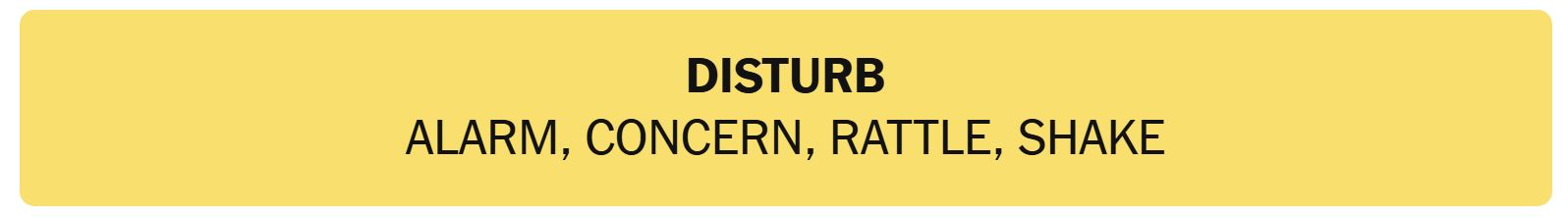 - DISTURB – ALARM, CONCERN, RATTLE, SHAKE
