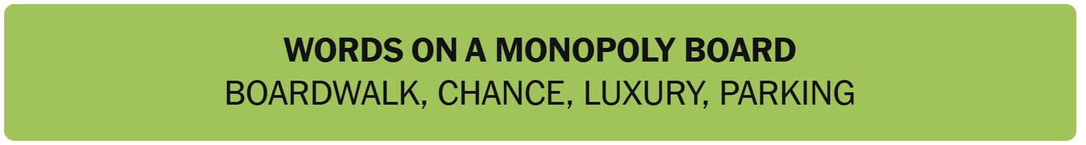 - WORDS ON A MONOPOLY BOARD – BOARDWALK, CHANCE, LUXURY, PARKING