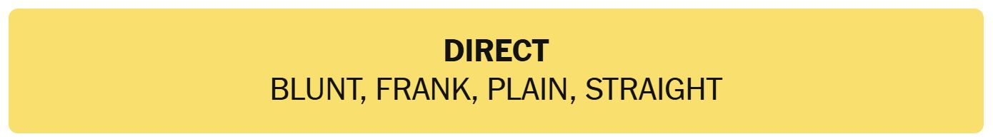 - DIRECT – BLUNT, FRANK, PLAIN, SHAKE