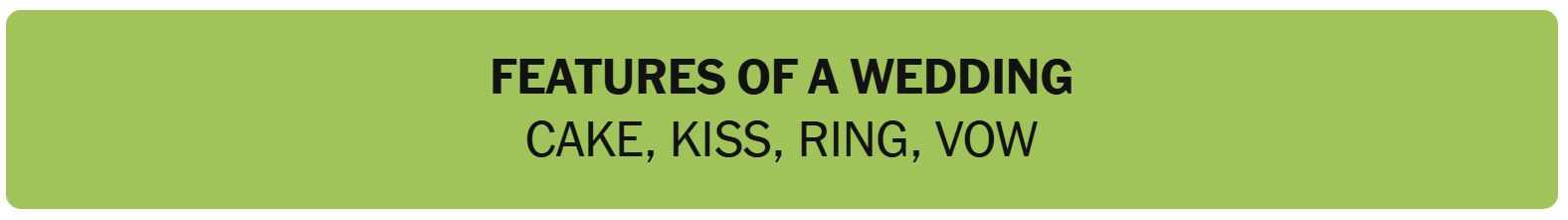 - FEATURES OF A WEDDING – CAKE, KISS, RING, VOW