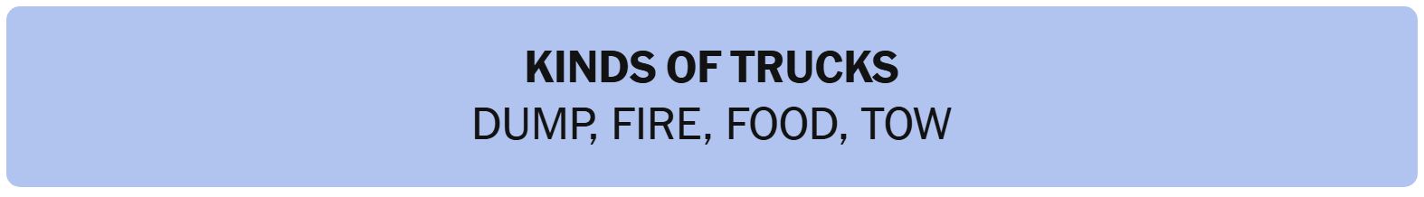 - KINDS OF TRUCKS – DUMP, FIRE, FOOD, TOW