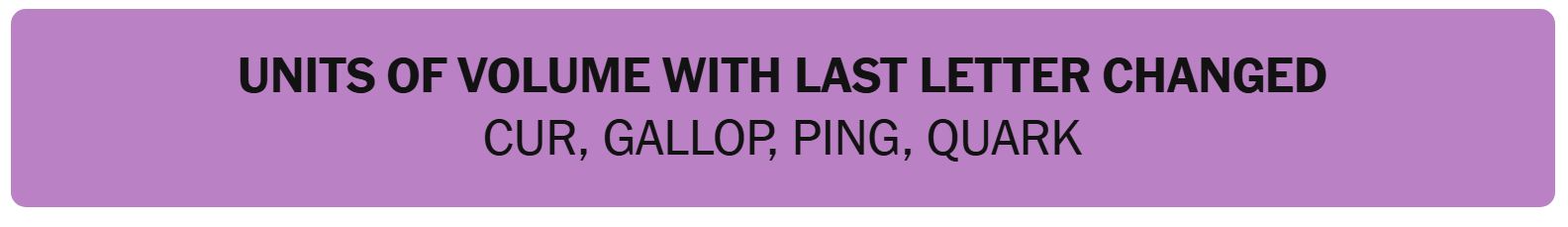 - UNITS OF VOLUME WITH LAST LETTER CHANGED – CUR, GALLOP, PING, QUARK
