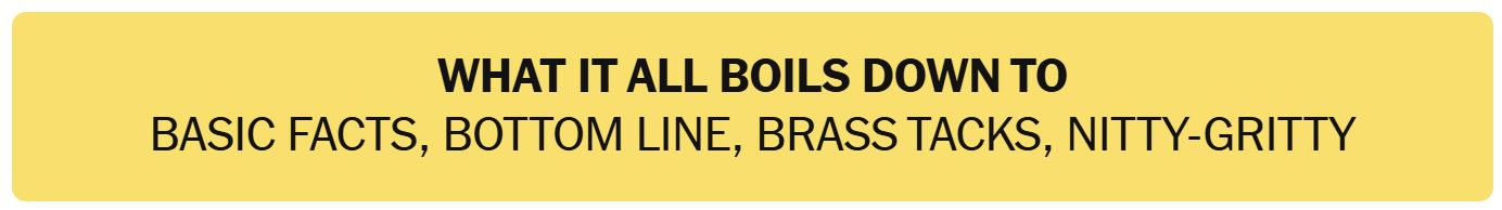 - WHAT IT ALL BOILS DOWN TO – BASIC FACTS, BOTTOM LINE, BRASS TRACKS, NITTY-GRITTY