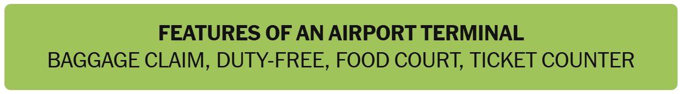 - FEATURES OF AN AIRPORT TERMINAL – BAGGAGE CLAIM, DUTY-FREE, FOOD COURT, TICKET COUNTER