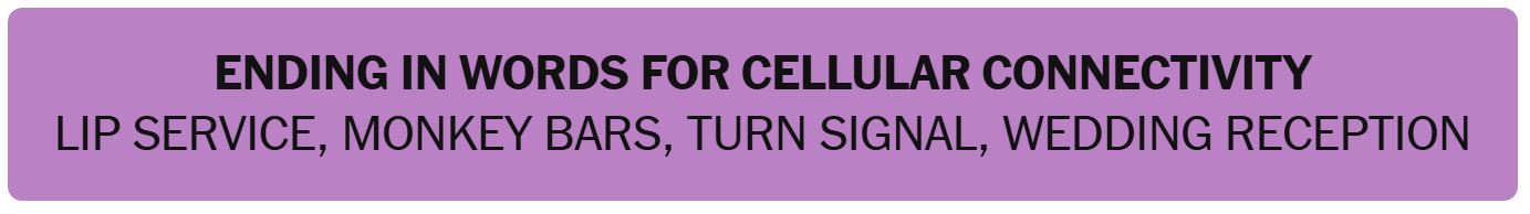- ENDING IN WORDS FOR CELLULAR CONNECTIVITY – LIP SERVICE, MONKEY BARS, TURN SIGNAL, WEDDING RECEPTION