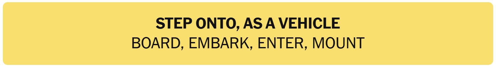 - STEP ONTO, AS A VEHICLE – BOARD, EMBARK, ENTER, MOUNT