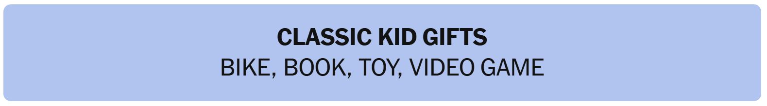 - CLASSIC KID GIFTS – BIKE, BOOK, TOY, VIDEO GAME