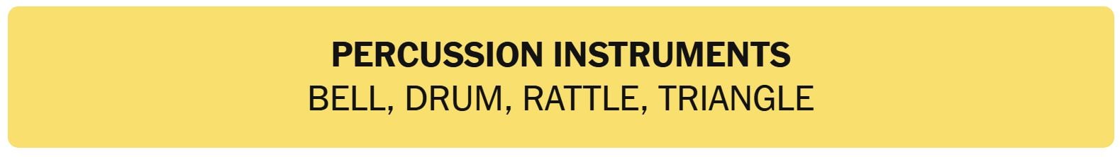 - PERCUSSION INSTRUMENTS – BELL, DRUM, RATTLE, TRIANGLE