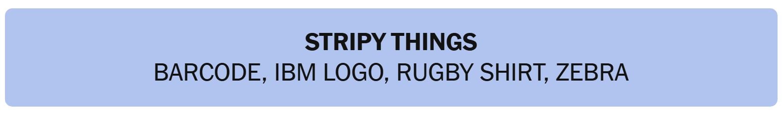 - STRIPY THINGS – BARCODE, IBM LOGO, RUGBY SHIRT, ZEBRA