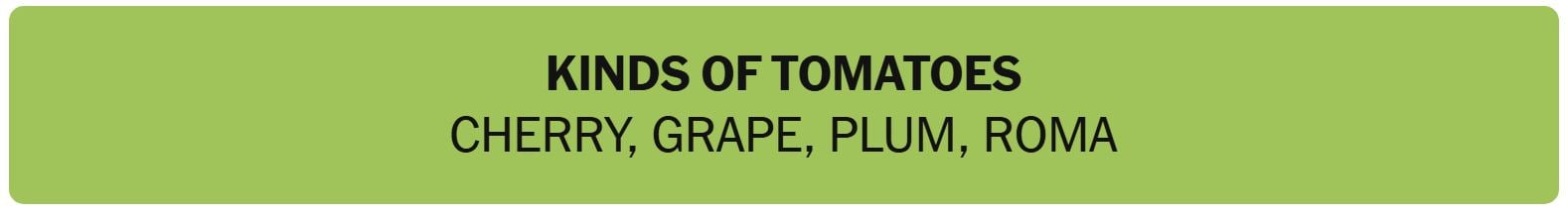 • KINDS OF TOMATOES – CHERRY, GRAPE, PLUM, ROMA