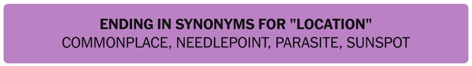 • ENDING WITH SYNONYMS FOR “LOCATION” – COMMONPLACE, NEEDLEPOINT, PARASITE, SUNSPOT