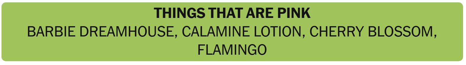 - THINGS THAT ARE PINK – BARBIE DREAMHOUSE, CALAMINE LOTION, CHERRY BLOSSOM, FLAMINGO