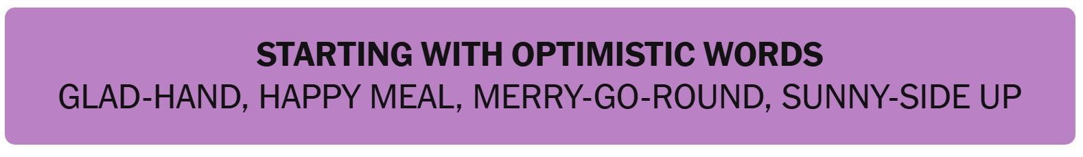 - STARTING WITH OPTIMISTIC WORDS – GLAD-HAND, HAPPY MEAL, MERRY-GO-ROUND, SUNNY-SIDE UP