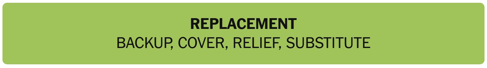 - REPLACEMENT – BACKUP, COVER, RELIEF, SUBSTITUTE
