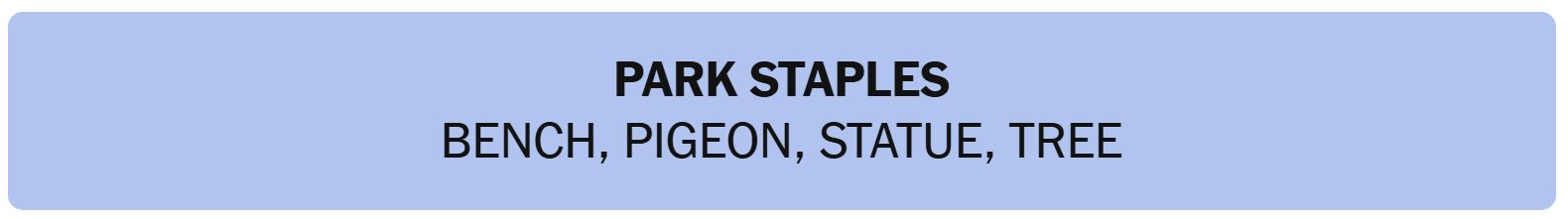 - PARK STAPLES – BENCH, PIGEON, STATUE, TREE