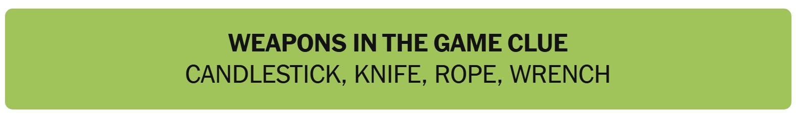 - WEAPONS IN THE GAME CLUE – CANDLESTICK, KNIFE, ROPE, WRENCH