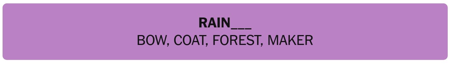 - RAIN ____– BOW, COAT, FOREST, MAKER