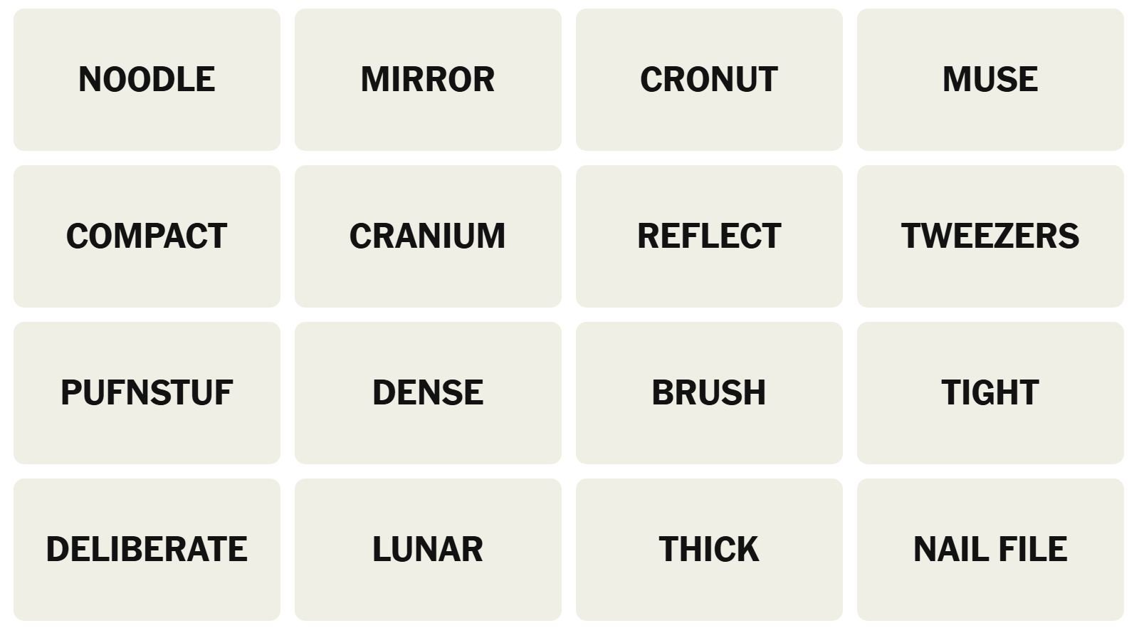 There are sixteen words for the Connection puzzles, which are: