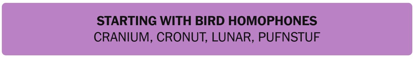 - STARTING WITH BIRD HOMOPHONES – CRANIUM, CRONUT, LUNAR, PUFNSTUF