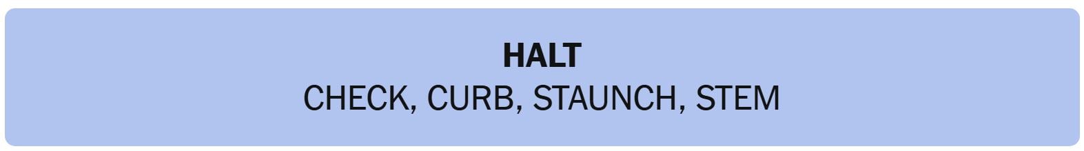 - HALT – CHECK, CURB, STAUNCH, STEM