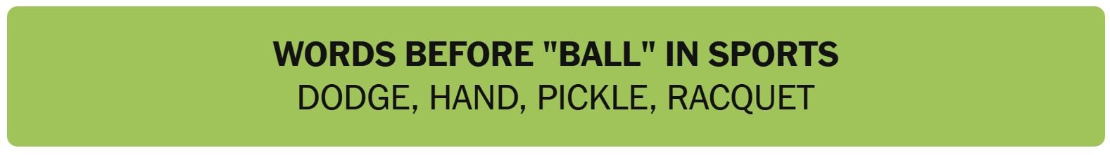 - WORDS BEFORE “BALL” IN SPORTS – DODGE, HAND, PICKLE, RACQUET