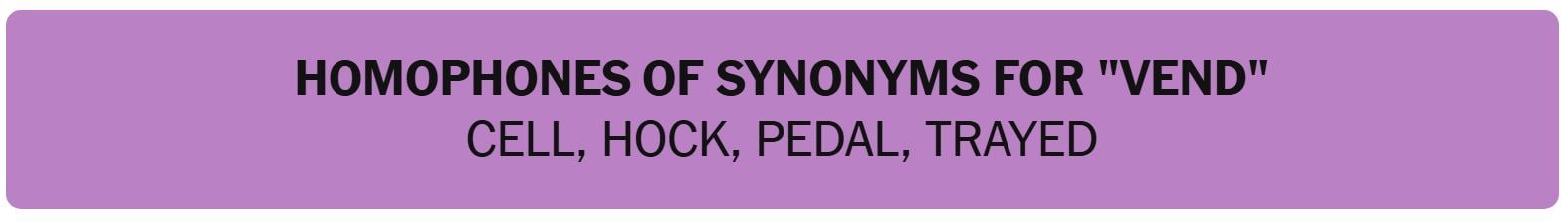 - HOMOPHONES OF SYNONYMS FOR “VEND”– CELL, HOCK, PEDAL, TRAYED