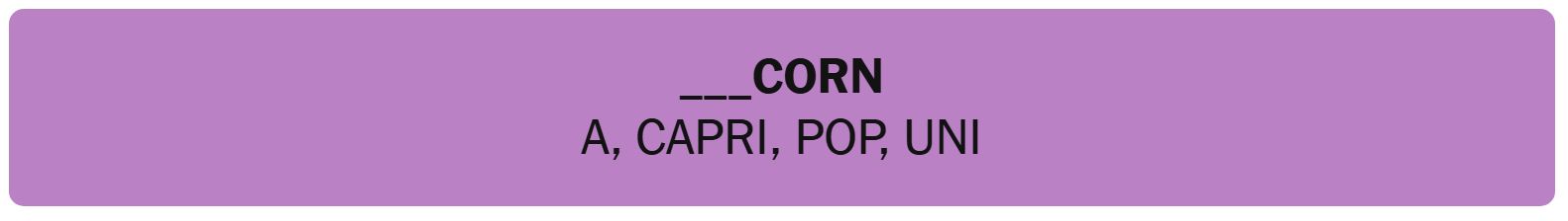 - Hint 4: One group of words are the prefix for the word “CORN“.