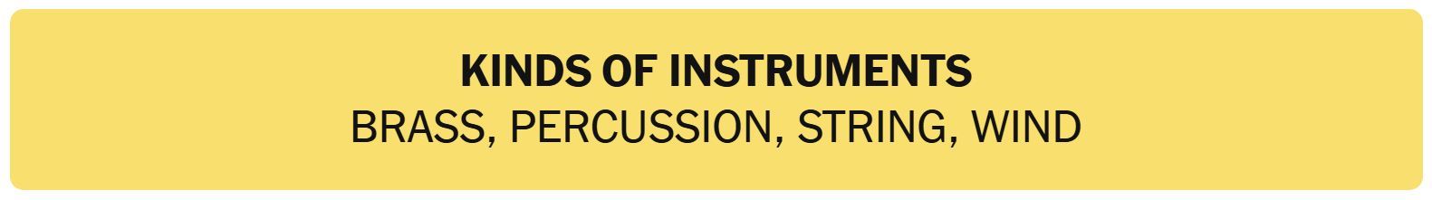 - KINDS OF INSTRUMENTS – BRASS, PERCUSSION, STRING, WIND