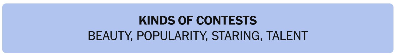 - KINDS OF CONTESTS – BEAUTY, POPULARITY, STARING, TALENT