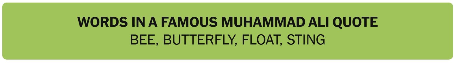 - WORDS IN A FAMOUS MUHAMMAD ALI QUOTE – BEE, BUTTERFLY, FLOAT, STING