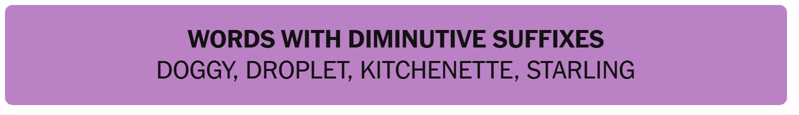 - WORDS WITH DIMINUTIVE SUFFIXES – DOGGY, DROPLET, KITCHENETTE, STARLING