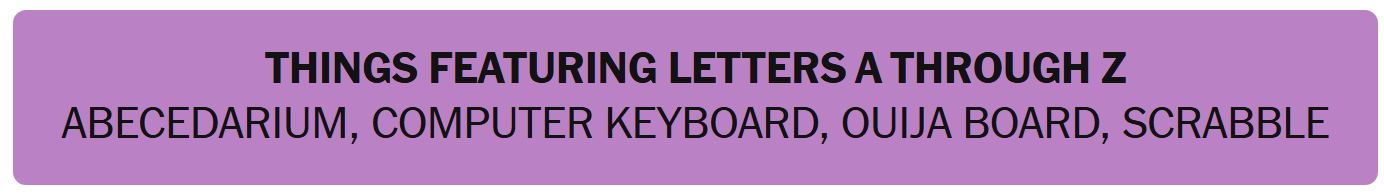 - THINGS FEATURING LETTER A THROUGH Z – ABECEDARIUM, COMPUTER KEYBOARD, OUIJA BOARD, SCRABBLE
