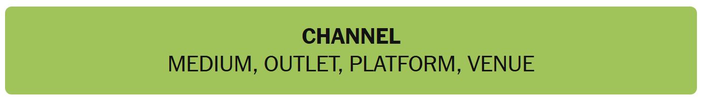 - CHANNEL – MEDIUM, OUTLET, PLATFORM, VENUE
