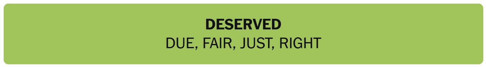 - DESERVED – DUE, FAIR, JUST, RIGHT