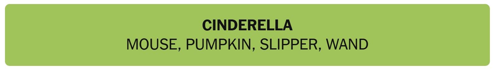 - CINDERELLA – MOUSE, PUMPKIN, SLIPPER, WAND