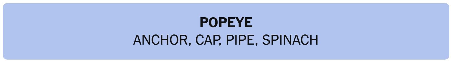 - POPEYE – ANCHOR, CAP, PIPE, SPINACH
