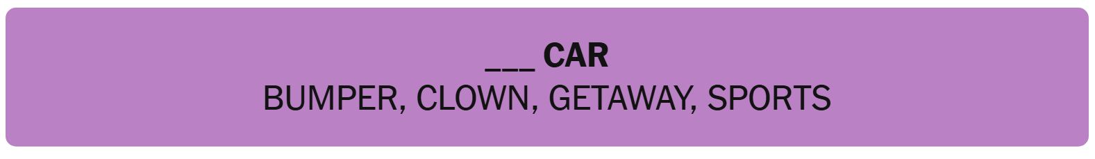 - ___ CAR – BUMPER, CLOWN, GETAWAY, SPORTS