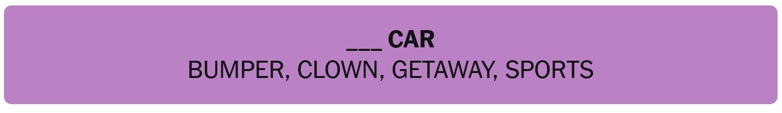 • ___ CAR – BUMPER, CLOWN, GETAWAY, SPORTS