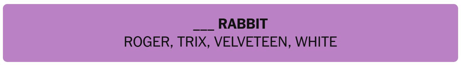 - ___ RABBIT – ROGER, TRIX, VELVETEEN, WHITE
