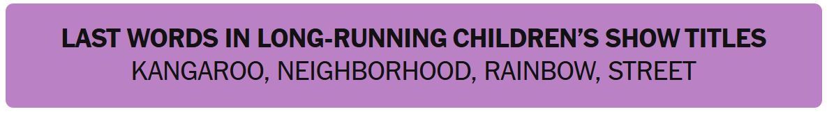 - LAST WORDS IN LONG-RUNNING CHILDREN’S SHOW TITLES – KANGAROO, NEIGHBORHOOD, RAINBOW, STREET