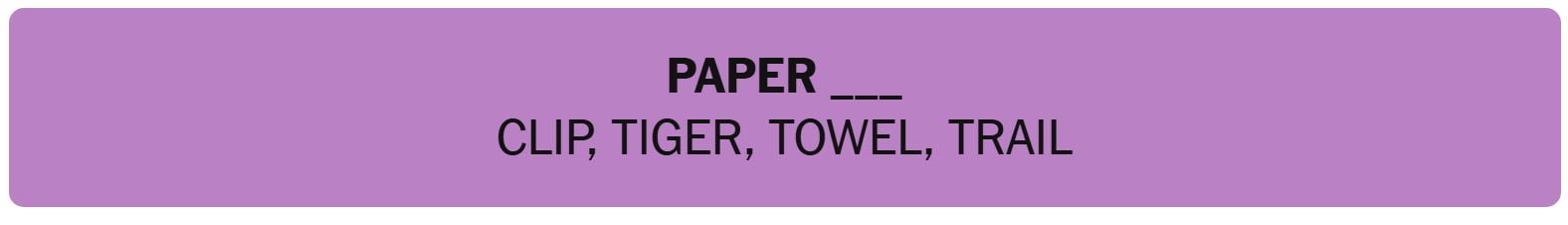 - PAPER ___ – CLIP, TIGER, TOWEL, TRAIL