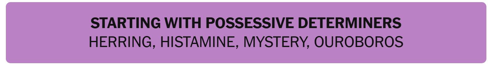 - STARTING WITH POSSESSIVE DETERMINERS – HERRING, HISTAMINE, MYSTERY, OUROBOROS