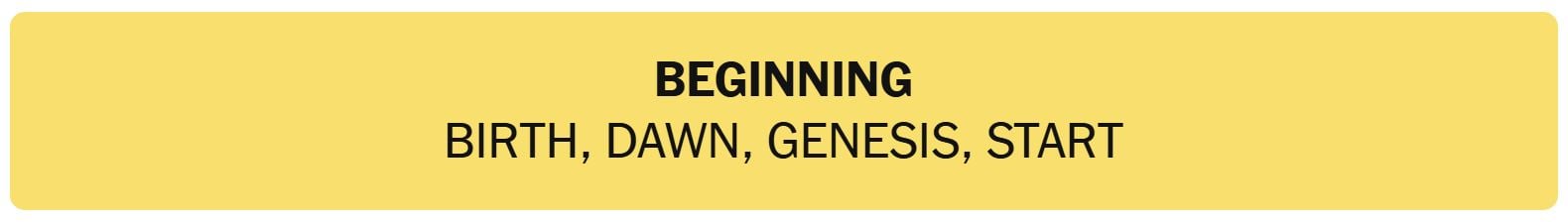• BEGINNING – BIRTH, DAWN, GENESIS, START